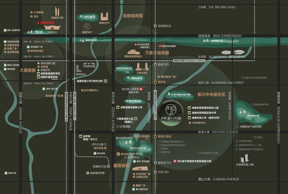 成都高新区做为西部经济引擎,绿地公园占比达17.5%,2.5公里范畴内坐落金苹果锦城一中等出名私立学府,以七星级办事营制人文社区空气,500米内双地铁笼盖(6号线新通大道坐、不雅东坐),项目择址新川焦点优良地块。